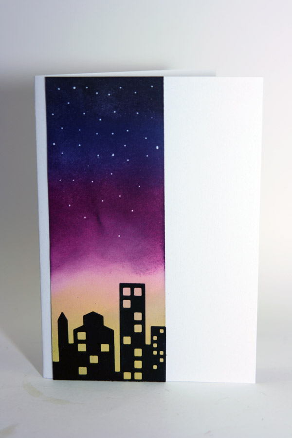 Both of your cards are gorgeous. Your Aurora Borealis sky is so beautifully done and I love that you hand drew the trees. Your cityscape card is also wonderful - the blended colors are spectacular. Thanks for linking up and playing with us at AAA Cards!