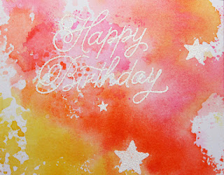 I used watercolor paper and the Simon Says Stamp Birthday Balloons set for the sentiment and the stars. I stamped them with Versamark ink and then heat embossed them with white embossing powder from Zing.