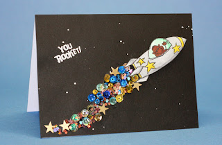 The rocket I stamped with Memento on Neenah solar white card and colored it with Spectrum Noir markers, then I cut him out.The sentiment is white heat embossing on a black panel I had splattered with white picket fence Distress spray stain I think the black looks like space and the white splatter like stars.